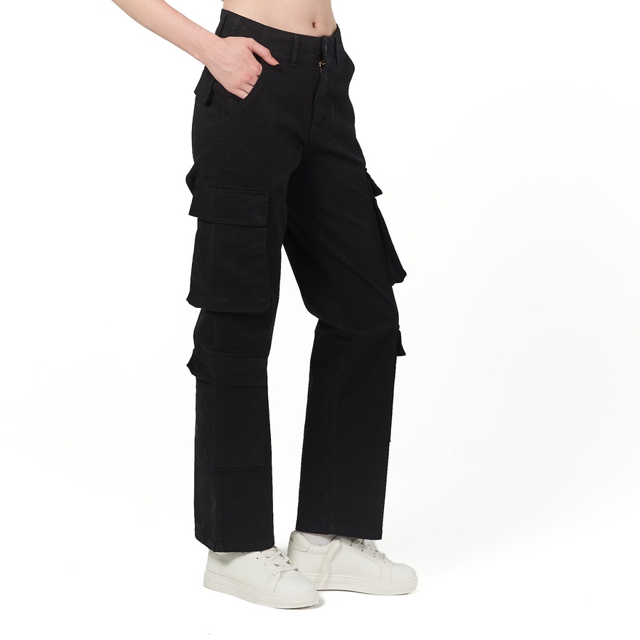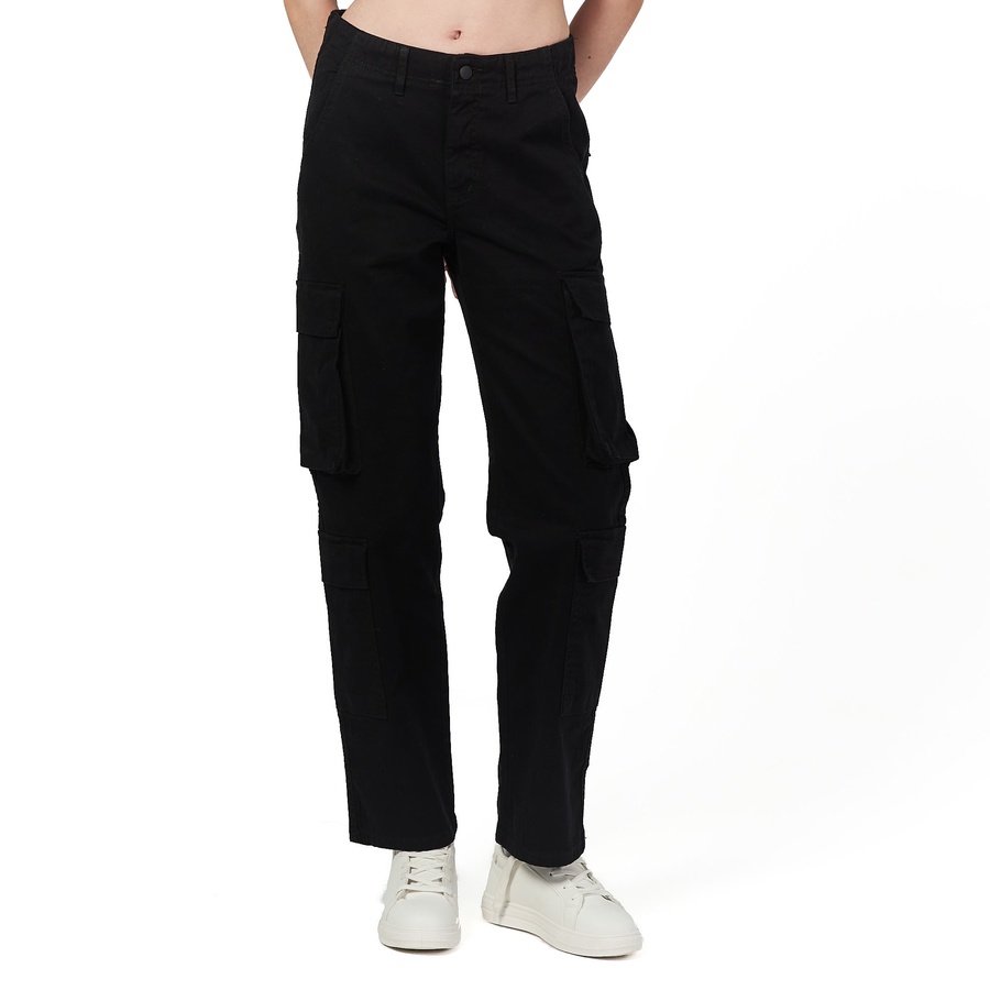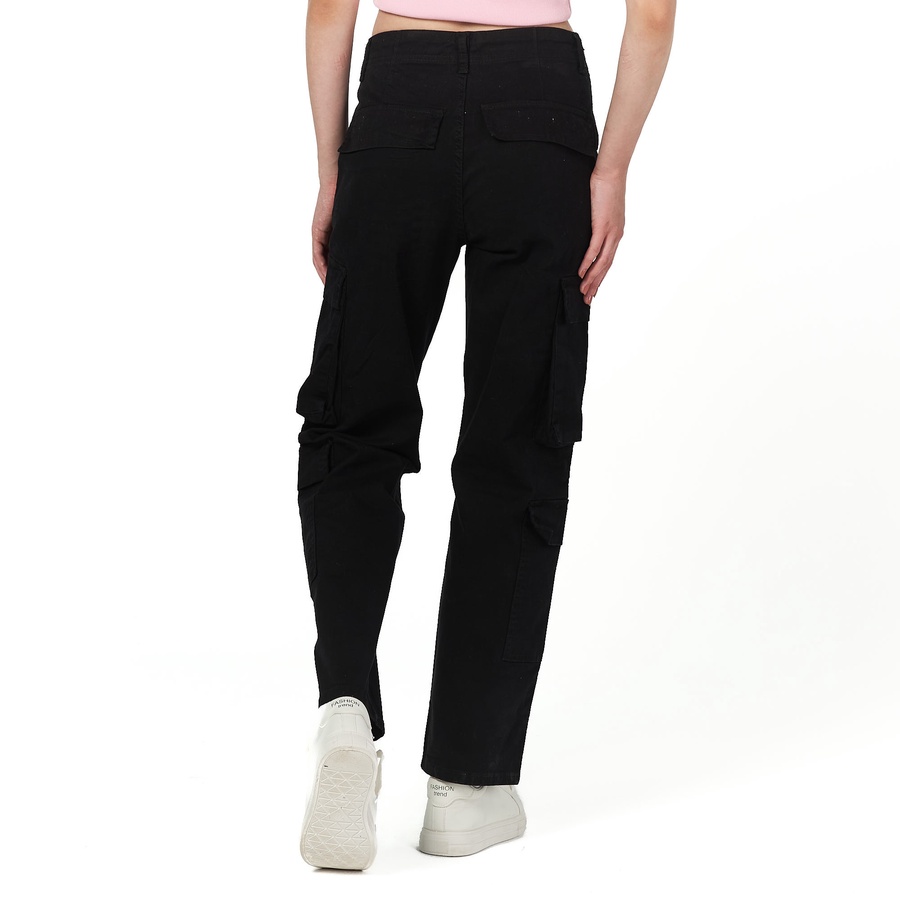 بنطلون كارجو حريمي بلون أسود بتصميم عملي وقصة مريحة، مزود بجيوب جانبية متعددة وخامة قوية.