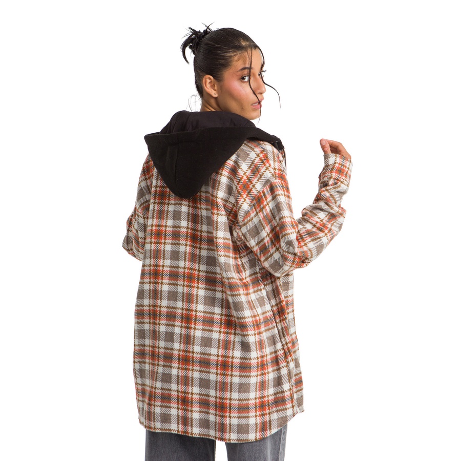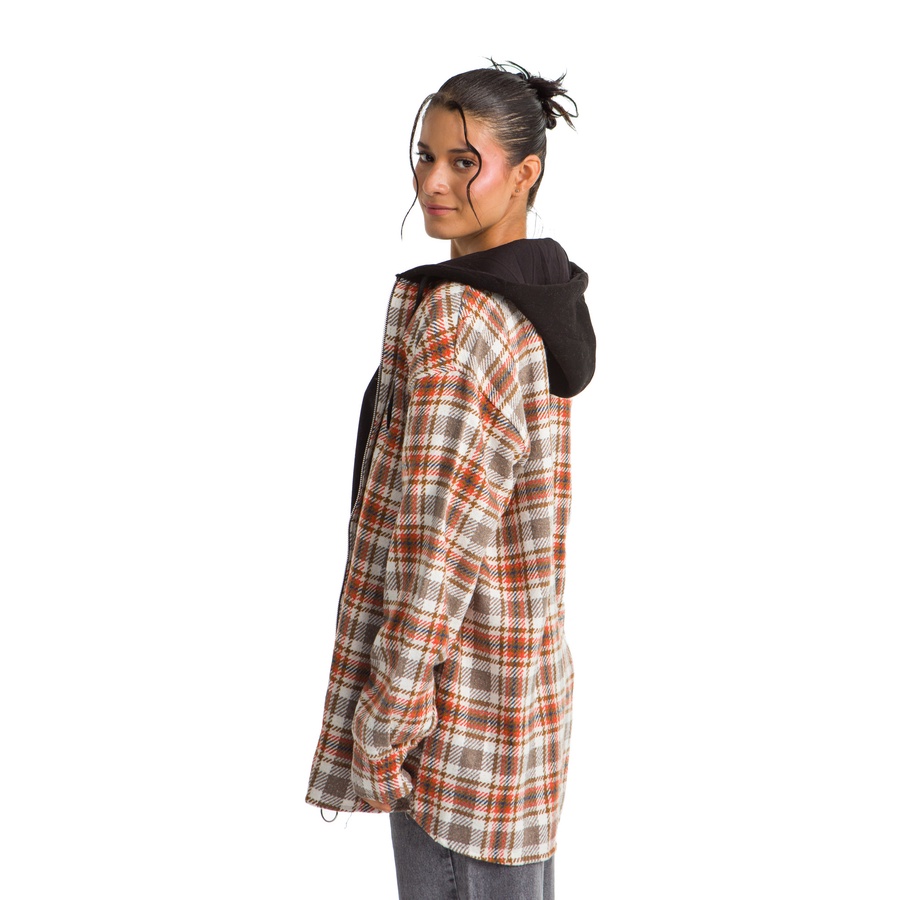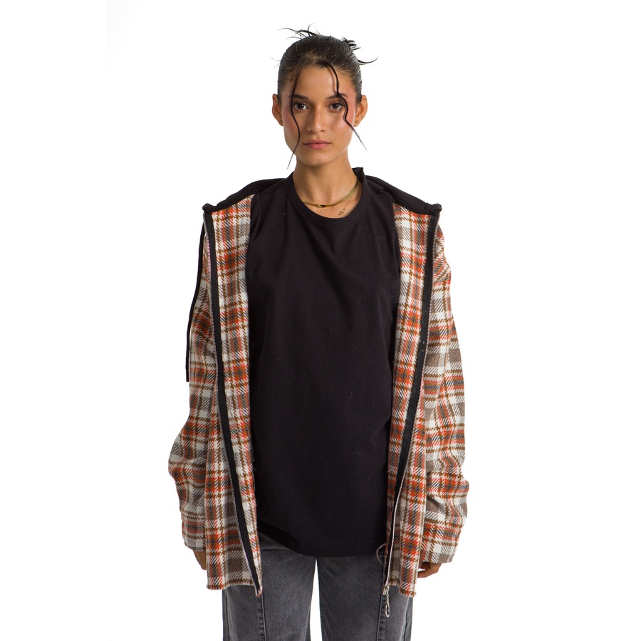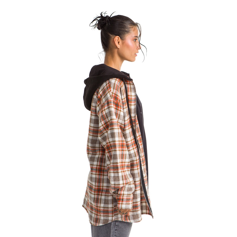 WOMEN HOODIE CHECKERED PLAID JACKET ORANGE BROWN