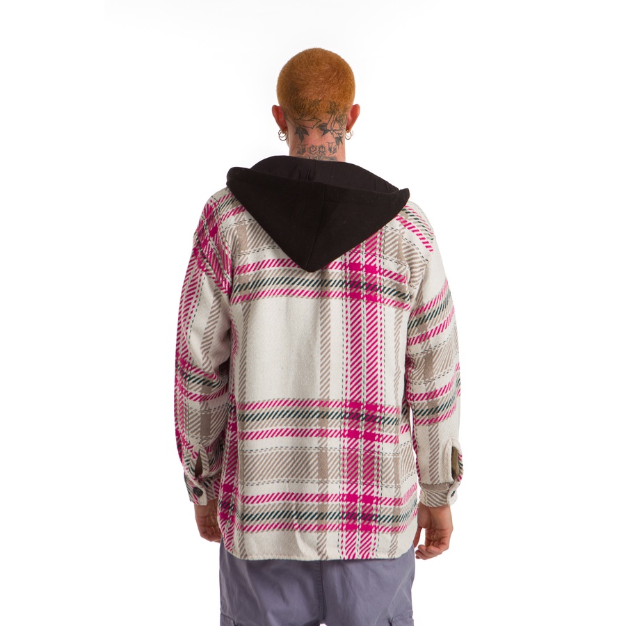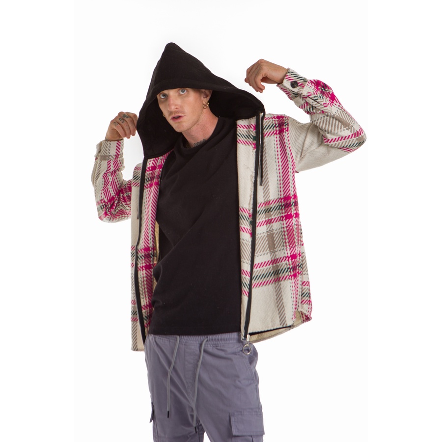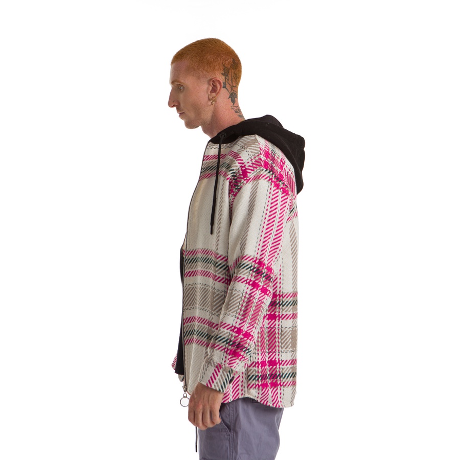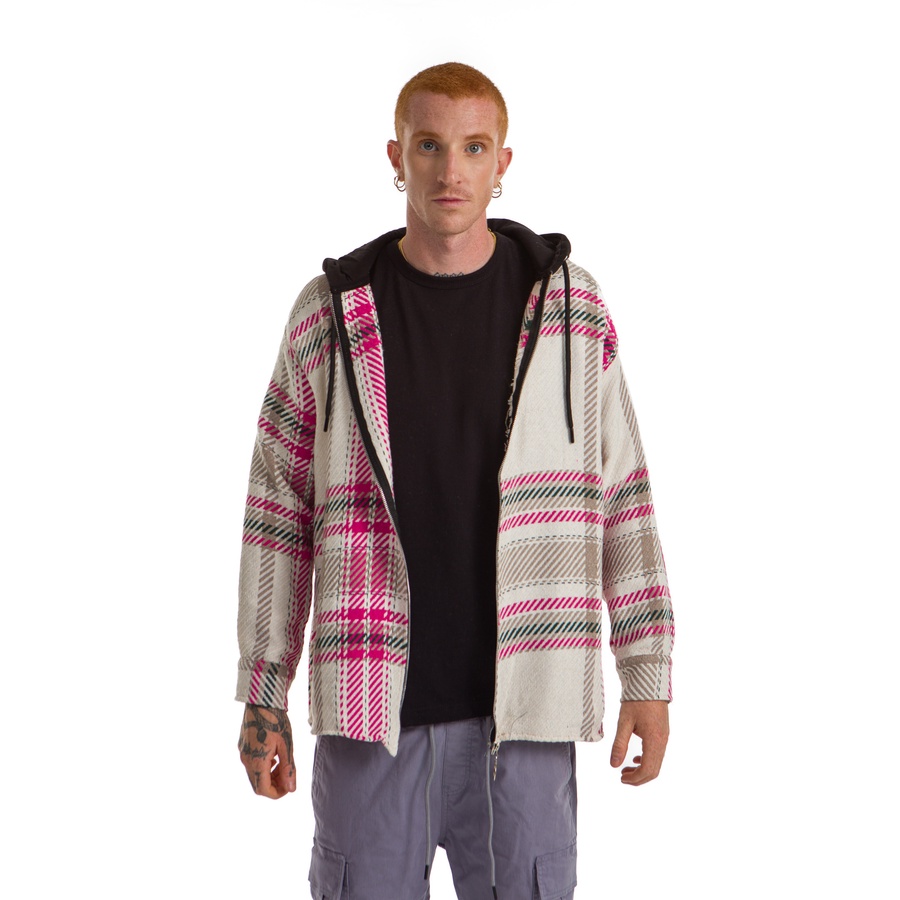 WHITE HOODIE CHECKERED PLAID JACKET ROSE BROWN WIDE STRIPED